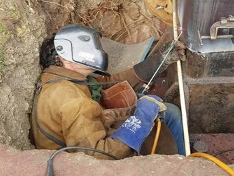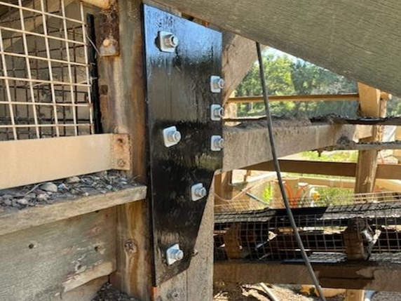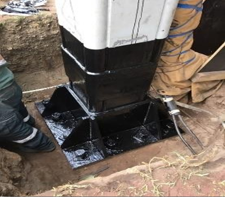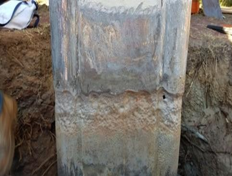 Регулярні інспекції виявили сильну корозію навколо лінії заземлення сталевих стовпів; 12,7-міліметрові пластини між 9-міліметровими трубами діаметром 100 мм. Компанія CoEng.biz була залучена для оцінки залишкової міцності, обстеження стовпів до з'єднання з опорною плитою на глибині близько 1 м нижче рівня землі та підготовки рекомендацій щодо усунення наслідків.